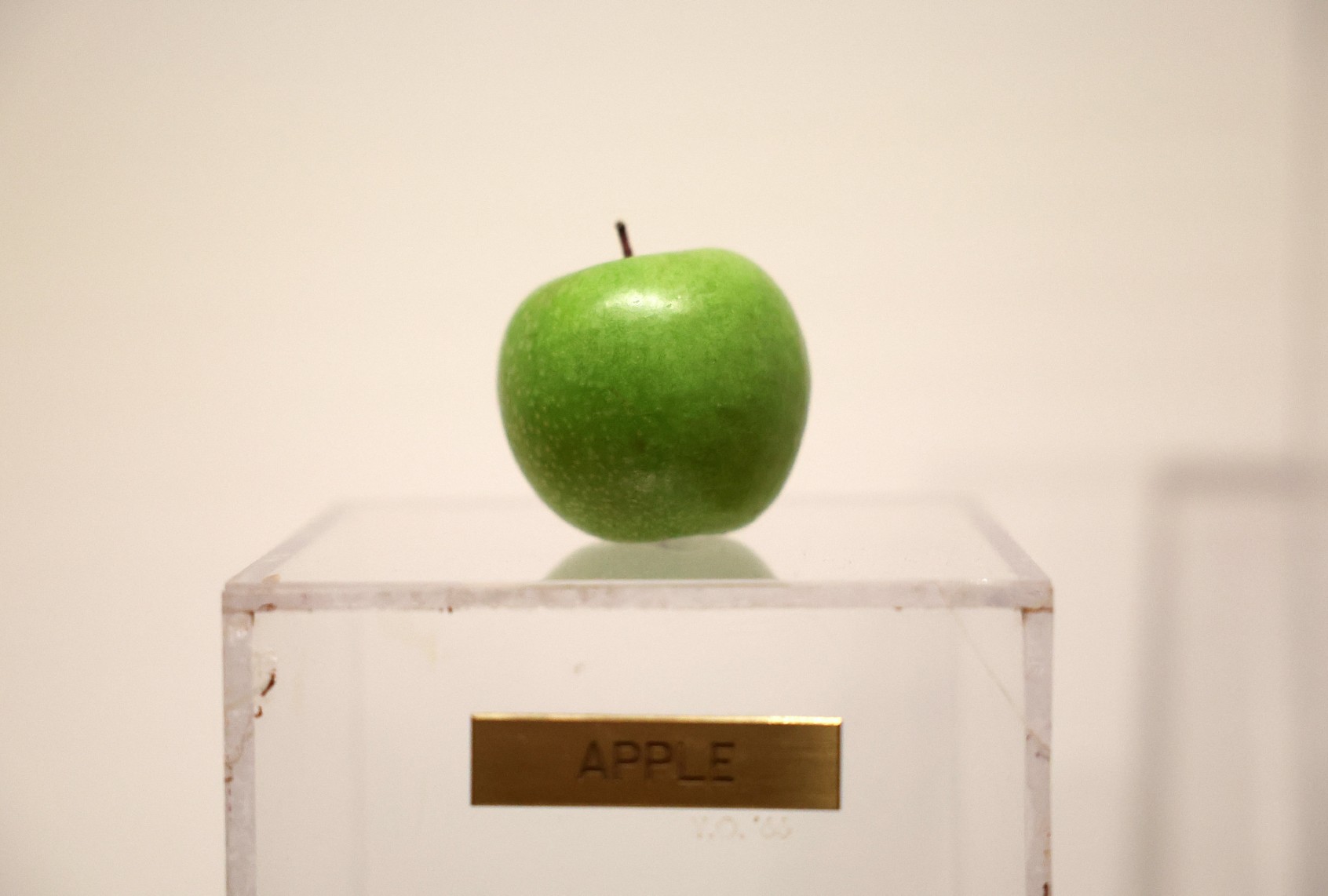 (DANIEL LEAL/AFP via Getty Images) An artwork entitled “Apple” 1966, is pictured during a photocall to promote the exhibition “Yoko Ono: Music of the Mind” at Tate Modern in London on February 13, 2024.